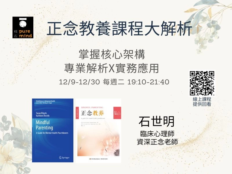 正念教養 正念教養課程大解析_四週視訊課 12/9-12/30 (二) 19:10-21:40 主講:石世明臨床心理師 邀請父母把焦點轉回自身,學習理解「我為何會如此反應」。透過正念練習,逐步看清過去經驗如何影響當下互動,並培養覺察與自我慈悲
