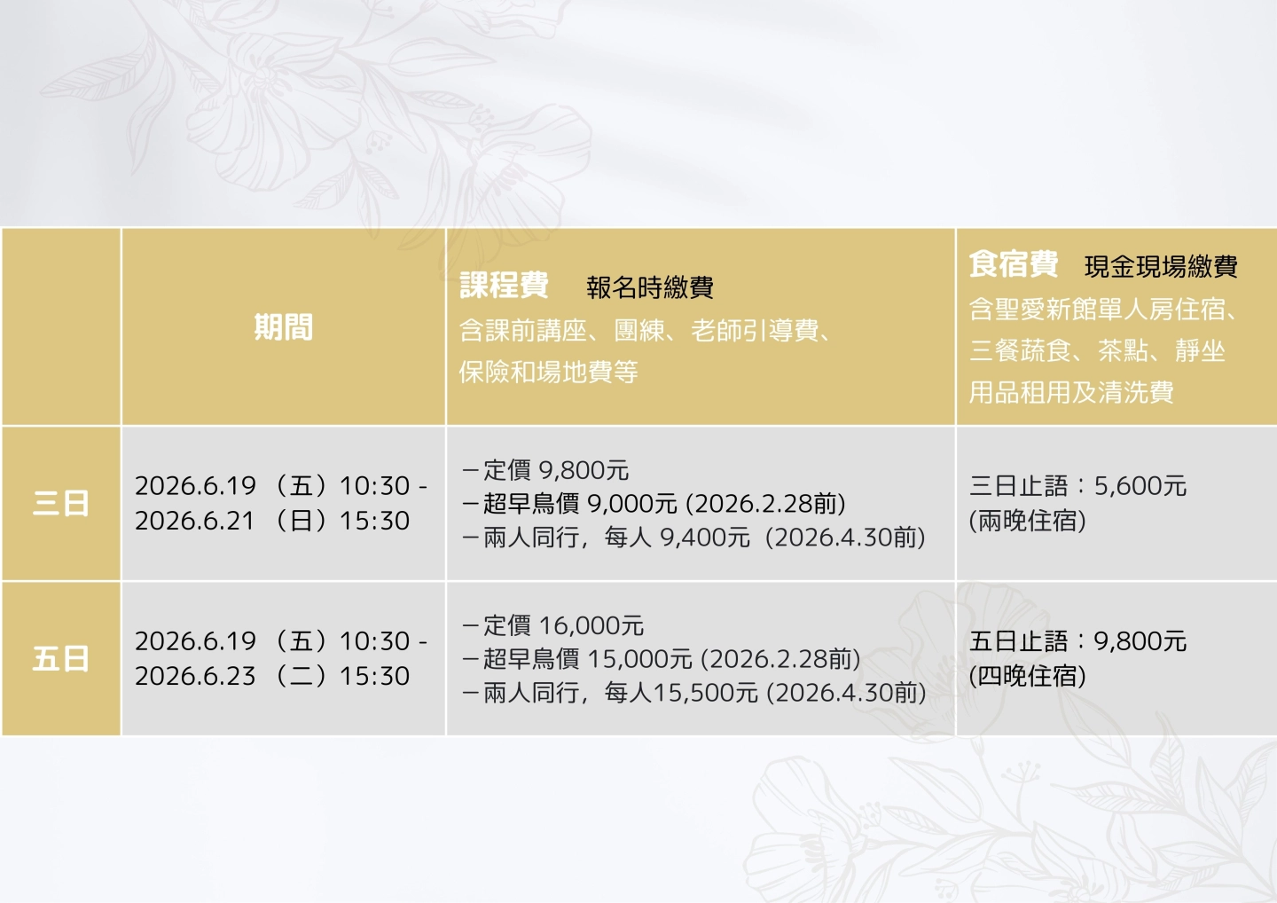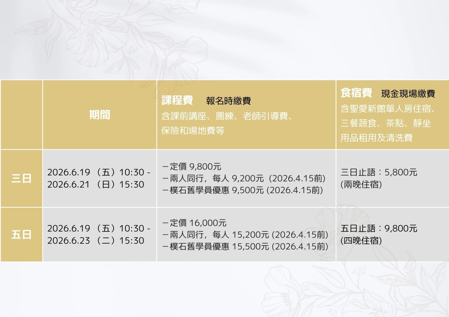 為了讓學員能更便利且彈性地安排行程,特別提供三日與五日靜修兩種選擇